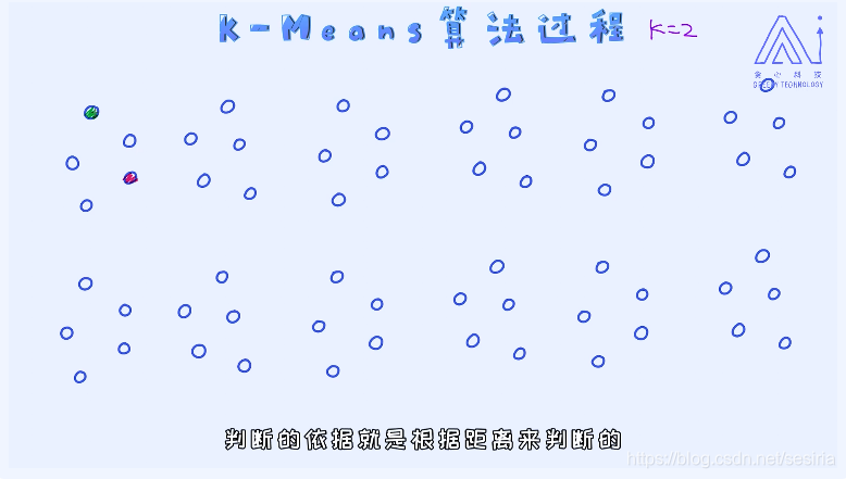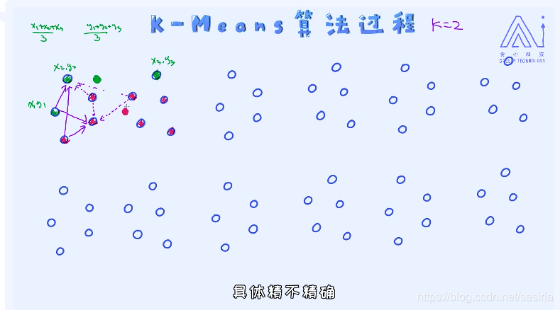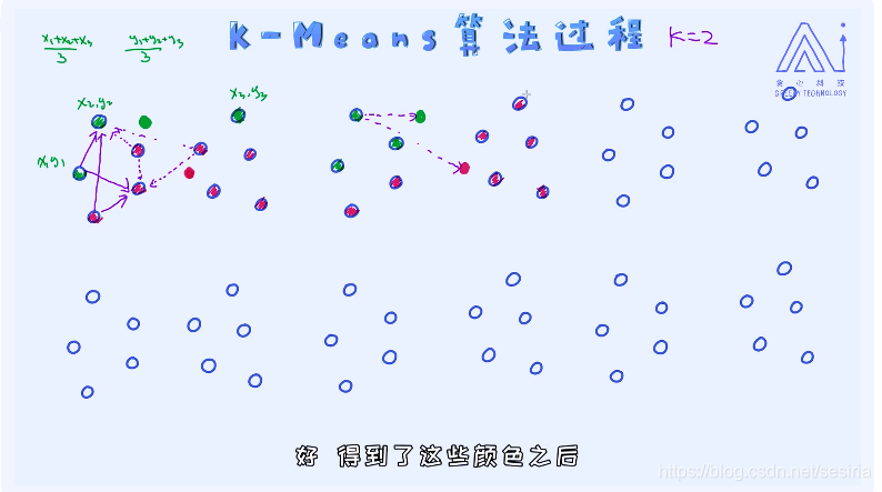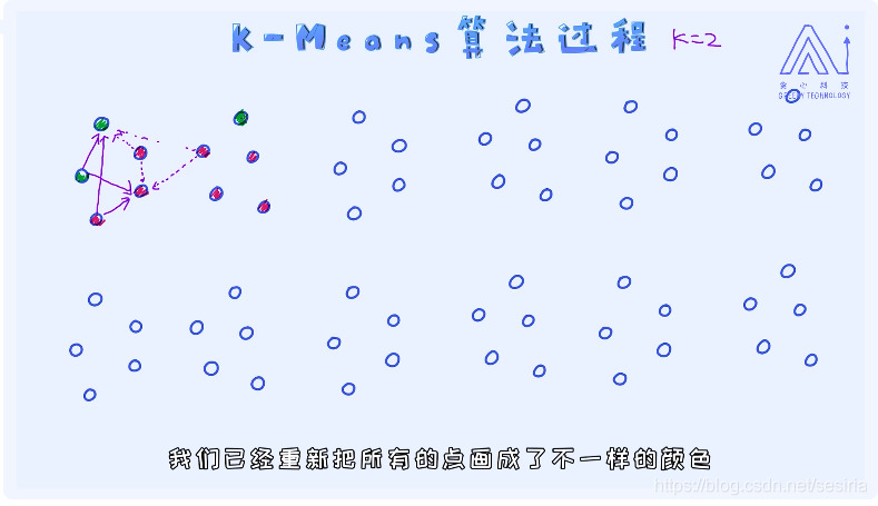 Then we recalculate the center point by the calculating the mean coordinate of each points of the respect cluster(category.)