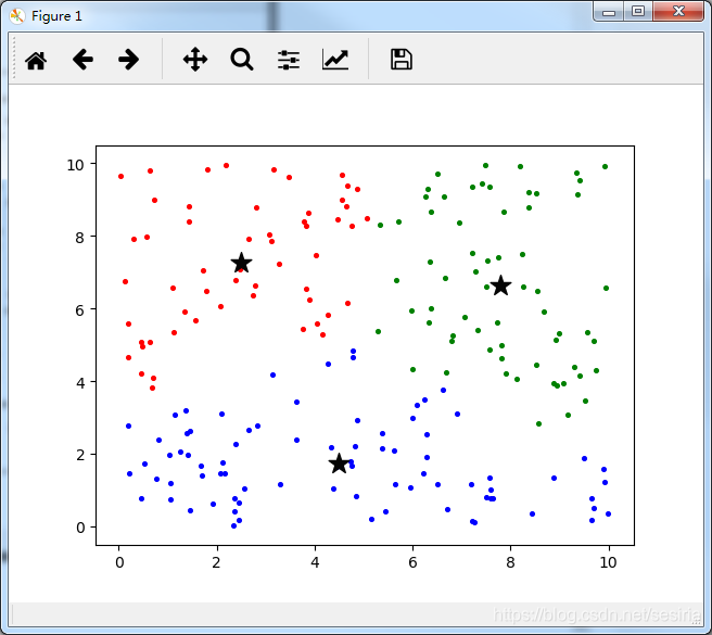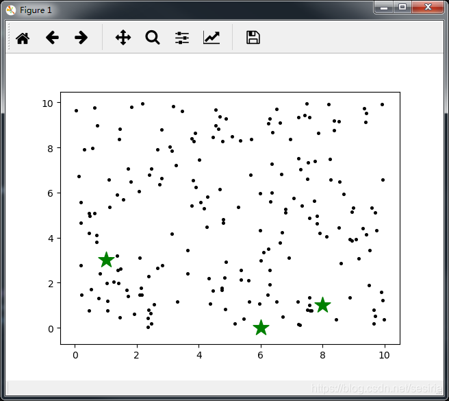 # import packagefrom copy import deepcopyimport numpy as npimport pandas as pdimport matplotlib.pyplot as plt# set paramter k for K-meansk = 3# randomize the center point. and save the result into CX = np.random.random((200, 2)) * 10C_x = np.random.choice(range(0, int(np.max(X[:, 0]))), size = k, replace = False)C_y = np.random.choice(range(0, int(np.max(X[:, 1]))), size = k, replace = False)C = np.array(list(zip(C_x, C_y)), dtype = np.float32)print("The init center point is :")print(C)# plot the center pointplt.scatter(X[:, 0], X[:, 1], c = '#050505', s = 7)plt.scatter(C[:, 0], C[:, 1], marker = '*', s = 300, c = 'g')plt.show()